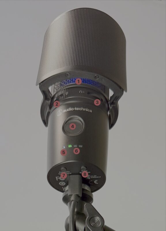 3. マイク本体のメッシュ部分にあるLEDインジケーターが青色に点灯すれば、電源が入り、Macに認識された状態です。