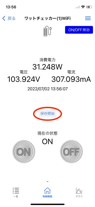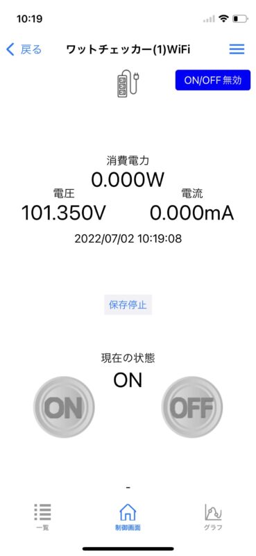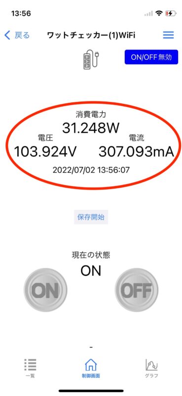 - 「現在の状況」が「ON」でリアルタイムな消費電力、電圧、電流の値が表示