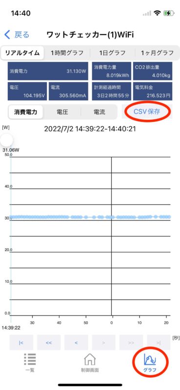 - 「グラフ」の画面で「リアルタイム」タブを表示してCSV保存をタップ